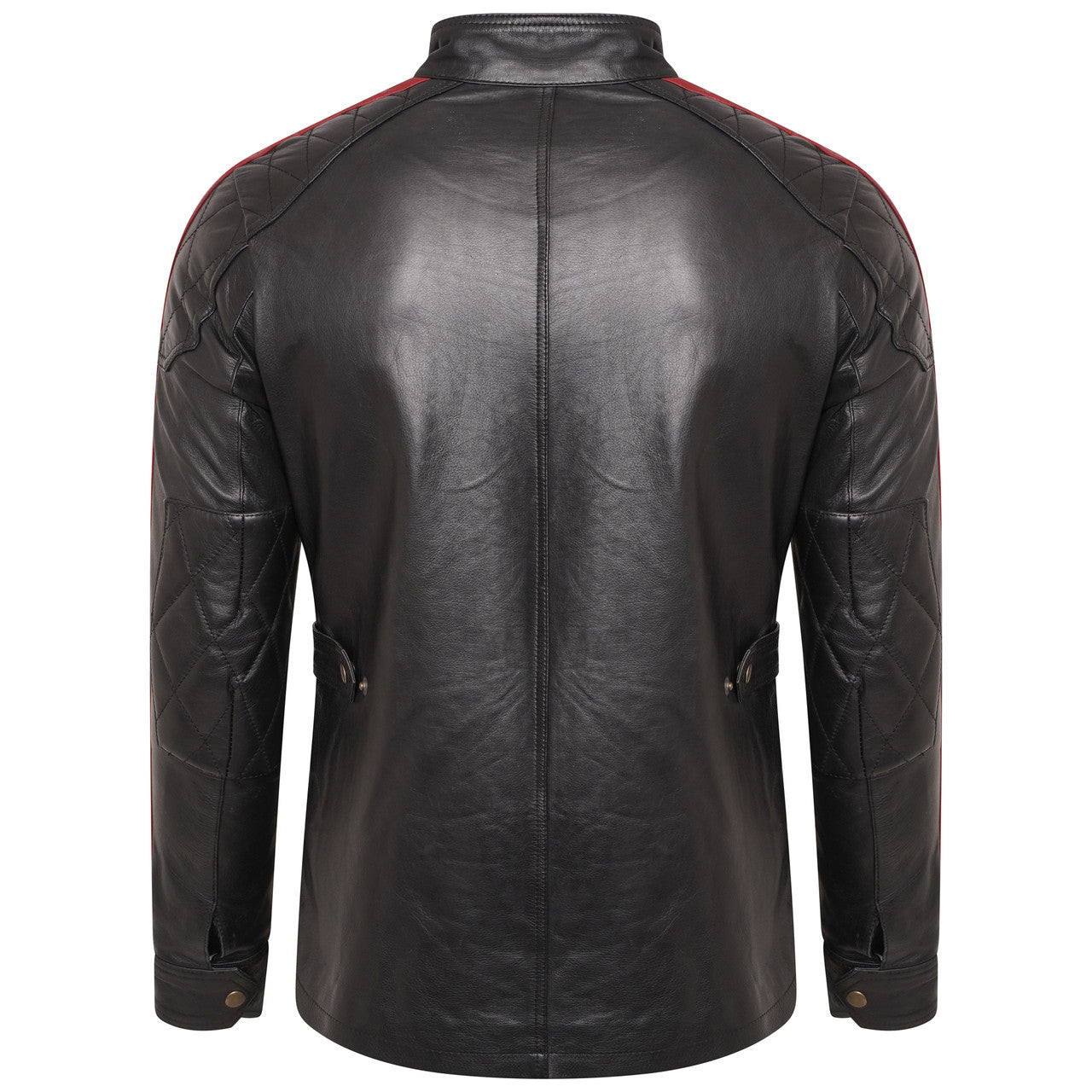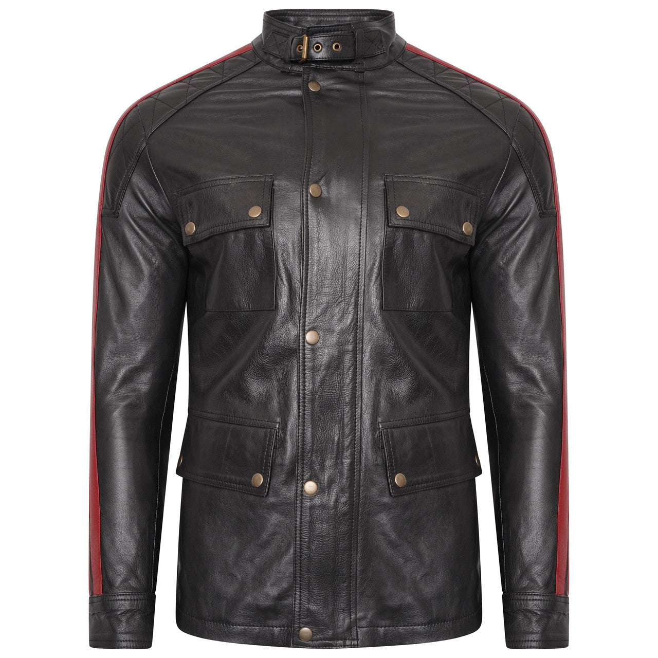 The Daytona Leather Jacket Red Stripe is a perfect fusion of classic biker attitude and modern edge. Crafted from premium leather, this leather jacket with red stripe delivers a sleek look and lasting comfort. Its bold detailing makes it a standout Daytona leather jacket that elevates your style, whether you’re on the road or out in the city. A must-have leather jacket red stripe design for men who ride with confidence.